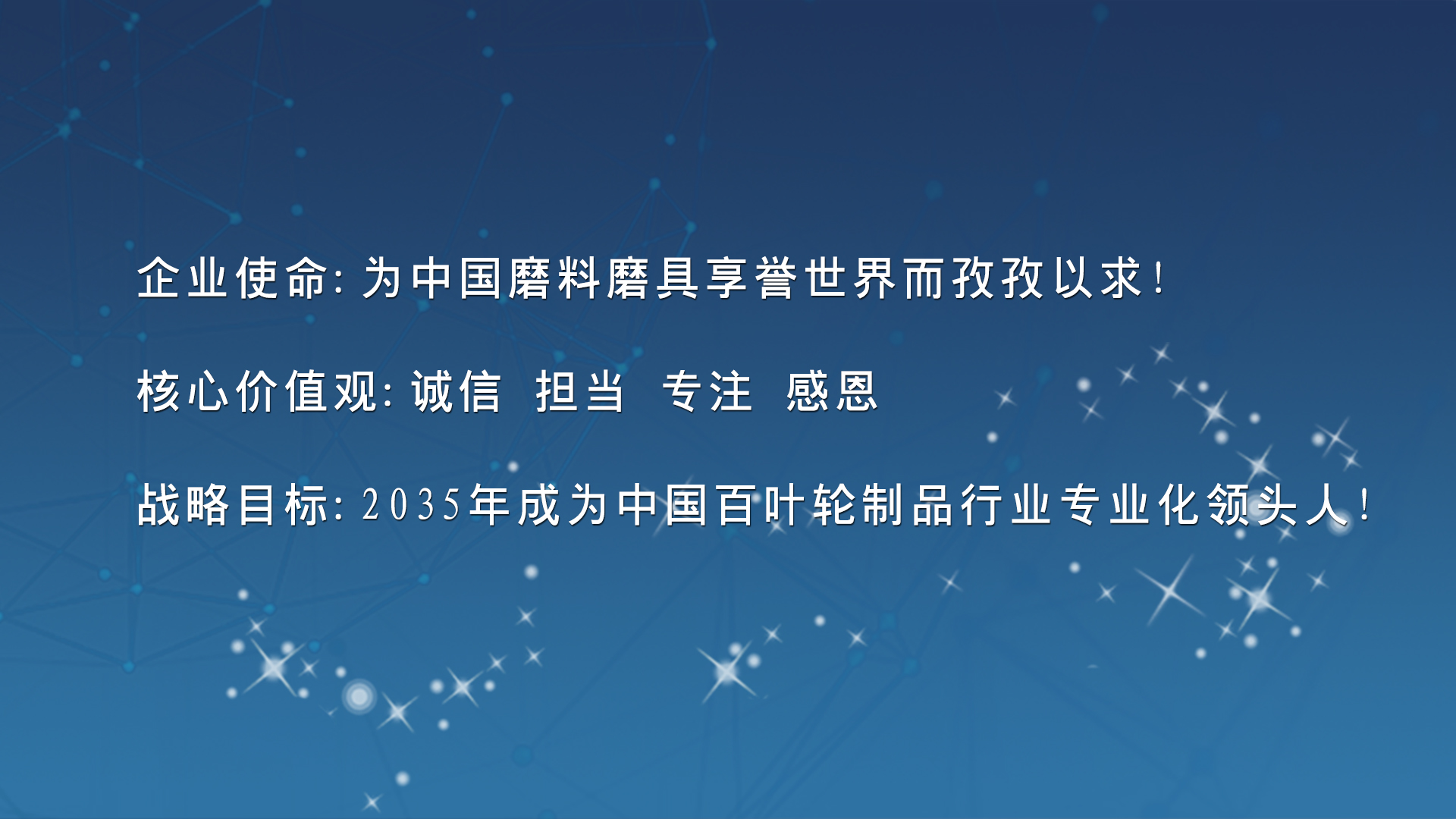 企業(yè)使命:為中國(guó)涂附磨具享譽(yù)世界而孜孜以求! 使命宣言:為客戶提供優(yōu)質(zhì)專業(yè)的產(chǎn)品和快速個(gè)性的服務(wù)! 為同仁構(gòu)建無限成長(zhǎng)的空間和共創(chuàng)共享的平臺(tái)! 為股東創(chuàng)造良好持續(xù)的收益和社會(huì)價(jià)值的實(shí)現(xiàn)! 為社會(huì)推動(dòng)行業(yè)正向的發(fā)展和國(guó)家經(jīng)濟(jì)的繁榮!